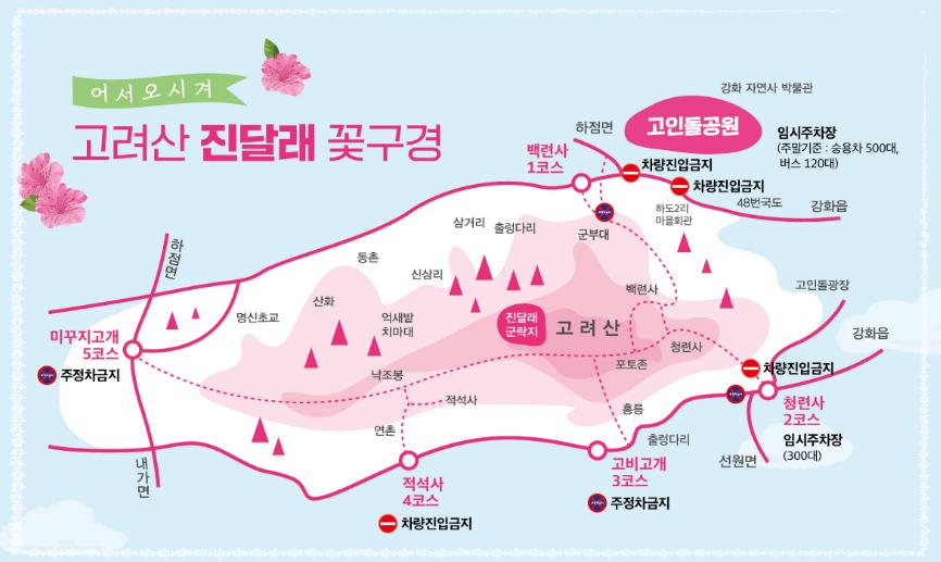오늘은 주말을 이용해 경기, 인천에서 가까운 강화도 고려산 진달래꽃 축제에 대해 행사 일정과 등산코드를 안내해 드리도록 하겠습니다.